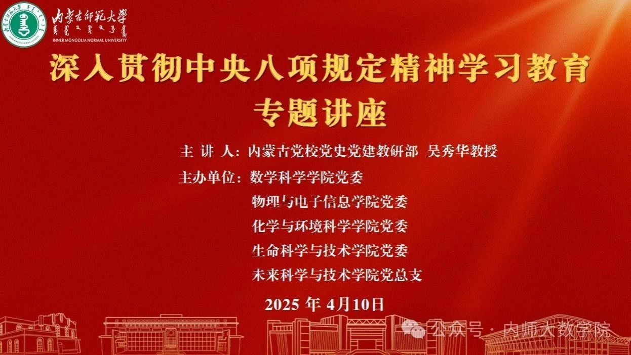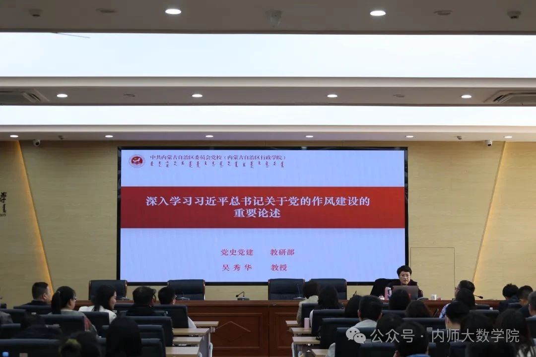 为深入贯彻落实党中央、自治区党委、学校党委深入贯彻中央八项规定精神学习教育精神和要求,高质量开展学习教育活动,4月10日,永利官网联合化学与环境科学学院、物理与电子信息学院、生命科学与技术学院和未来科学与技术学院在赛罕校区行政楼三楼报告厅举办深入贯彻中央八项规定精神学习教育读书班专题讲座。讲座邀请内蒙古党校党史党建教研部吴秀华教授作题为“深入学习习近平总书记关于党的作风建设的重要论述”专题讲座。