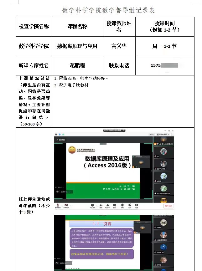 学院领导班子、教学委员会、督导组通过随机进入线上课程观看教师在线授课实况、查阅在线教学资源、了解学生在线学习互动等方式开展教学督导检查,并填写教学督导记录表,及时反馈督导检查情况。
