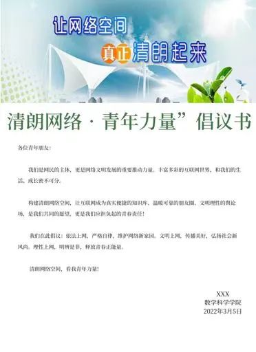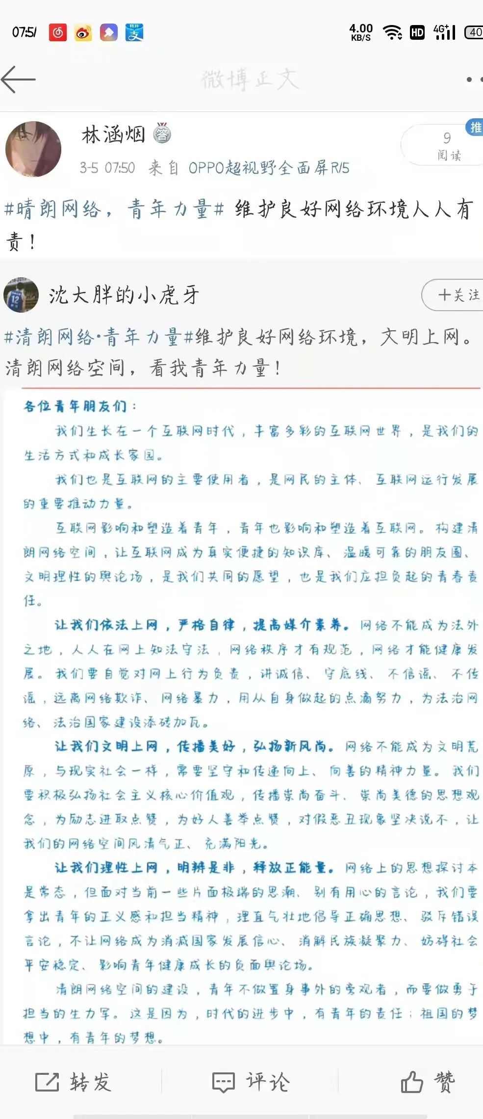 为进一步贯彻落实习近平总书记和党中央的重要要求,动员广大团员青年积极参与构建清朗网络空间,永利3044noc永利3044noc组织各班进行了“清朗网络,青年力量”主题活动,号召大家积极按照习近平总书记提出的“勤学、修德、明辨、笃实”要求,将共青团员的先进性和担当精神延伸到网上,在网上积极发出青年好声音、形成强劲青春正能量。